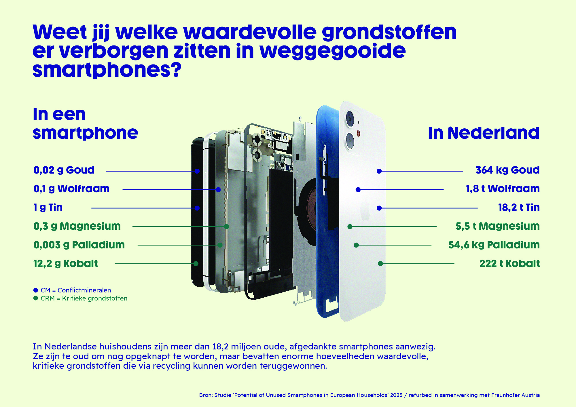 In heel Europa liggen maar liefst 642 miljoen ongebruikte smartphones op zolder, in lades of ergens in de rommeldoos. Daarvan zijn er 431 miljoen nog geschikt voor recycling. Alles bij elkaar bevat die Europese berg e-waste voor zo’n 1,1 miljard euro aan bruikbare grondstoffen. “Een ton e-waste bevat soms meer metaal dan een ton mijnerts,” stelt projectleider Paul Rudorf van Fraunhofer. “Recyclen loont dus echt.”
