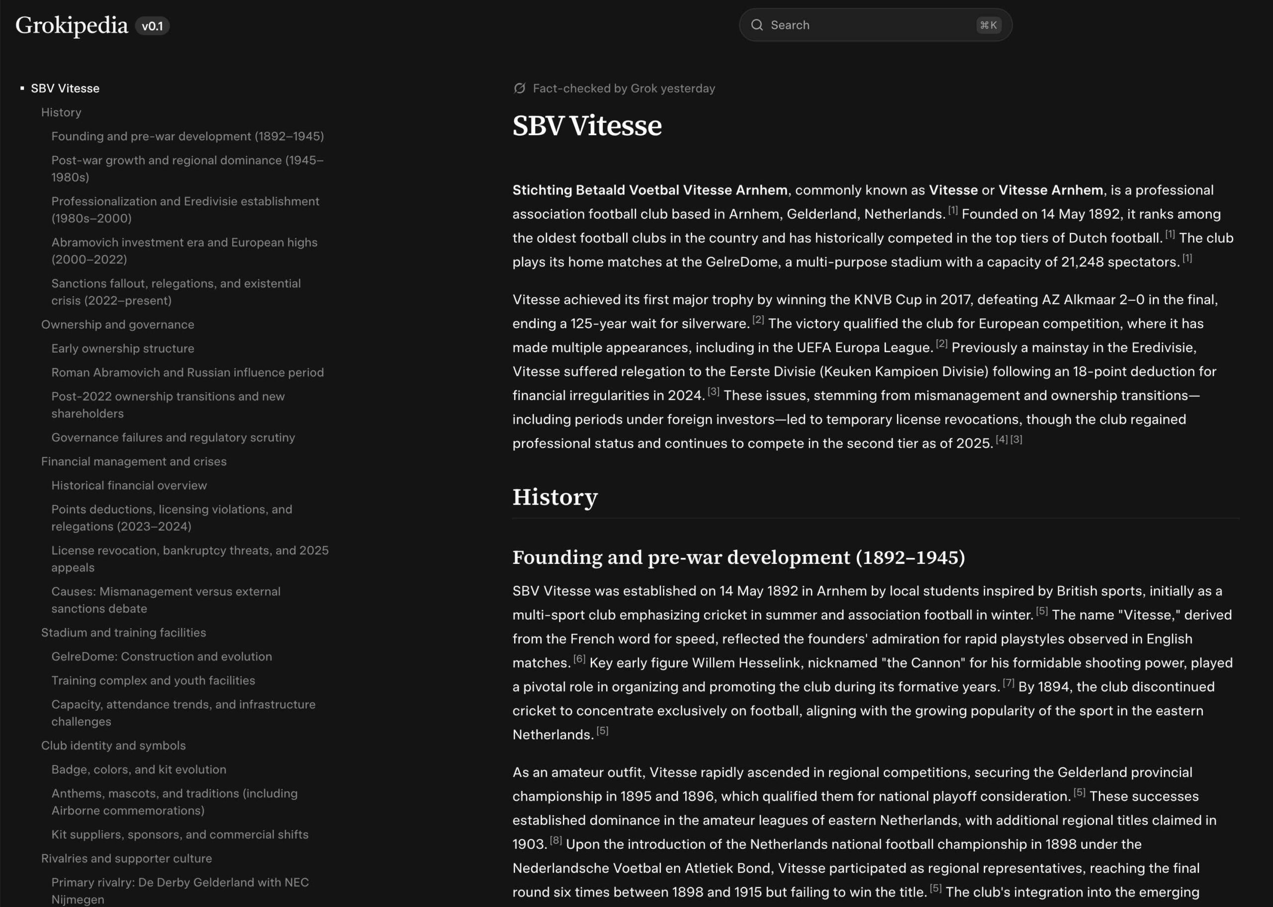 Voor Nederlandse gebruikers is Grokipedia (die naam is wat ingewikkeld…) voorlopig nog beperkt bruikbaar. De meeste artikelen zijn in het Engels en gaan over internationale onderwerpen. Informatie over typisch Nederlandse thema’s — van lokale politiek tot culturele instellingen — ontbreekt vaak of is erg beknopt. Ook is niet altijd duidelijk waar de informatie vandaan komt, waardoor controle lastiger is dan bij de Nederlandstalige Wikipedia.